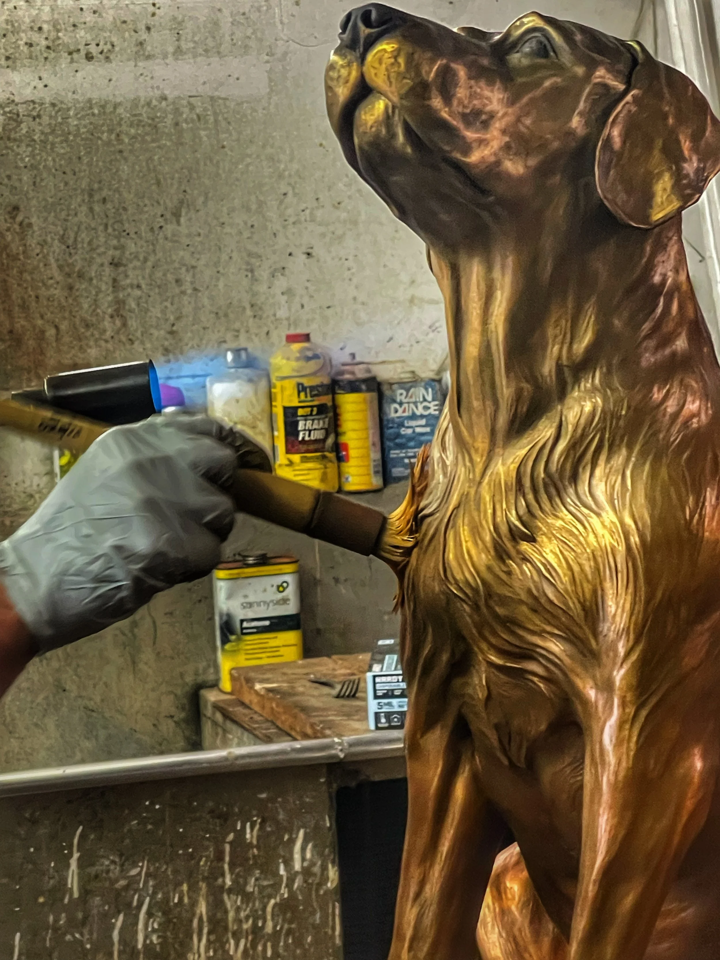 Jake receiving his patina — the final breath of fire before bronze becomes forever. Grateful for the gifted hands of artist Joe Wayne, whose eye for color and touch with flame bring warmth and soul to metal.